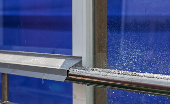 인터넷에 검색해보니 빗물막이 차양막과 난간에 캡 형태로 씌워서 빗물이 튀는 것을 방지하는 장치들을 발견했다.