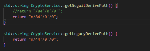 저번에 블루월렛 등록에 맞게 DerivePath를 리턴하는 함수 안의 텍스트를 수정했었는데 이게 내부에서도 사용한다.