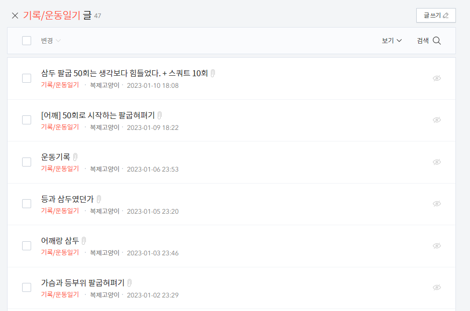 지금은 정해진 날마다 팔굽혀펴기나 간단한 운동을 하고 기록하는 것을 하고 있다. 원래는 그냥 공개된 게시글로 올렸었는데 최근에 구글 애드센스가 반려되어서 간단한 글로만 되어있는 주제는 비공개처리하고 작성 중이다. 이럴 줄 알았으면 다른 블로그를 만들어서 거기서 애드센스용 글작업을 하는 게 나았을까 싶다.