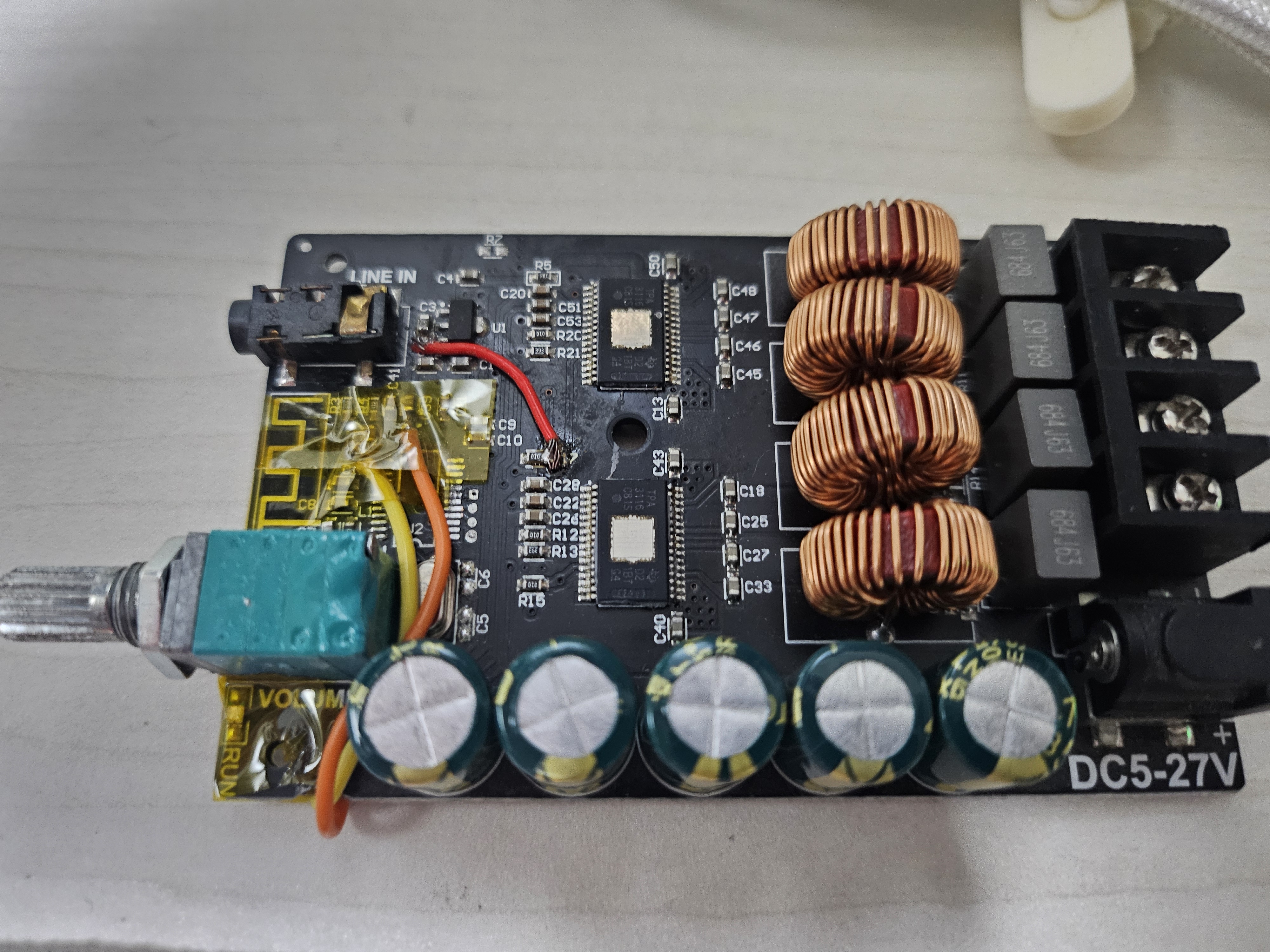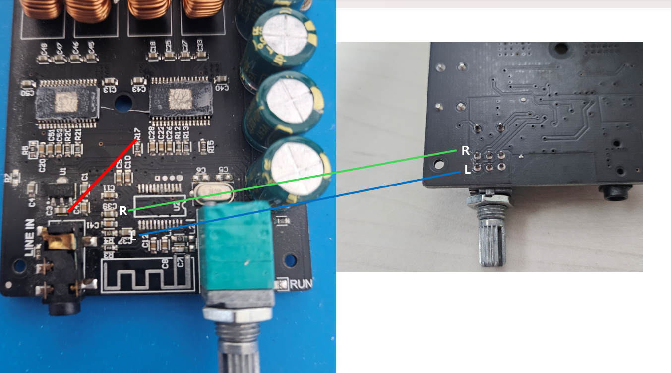 R 신호는 C39, L 신호는 C37 에 연결하면 된다. 볼륨조절 노브가 붙은 뒤쪽이 있어서 그나마 쉽게 연결했다.