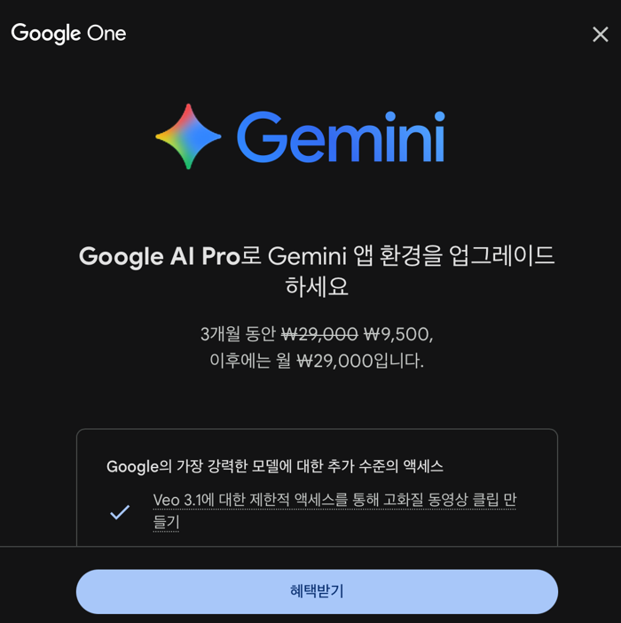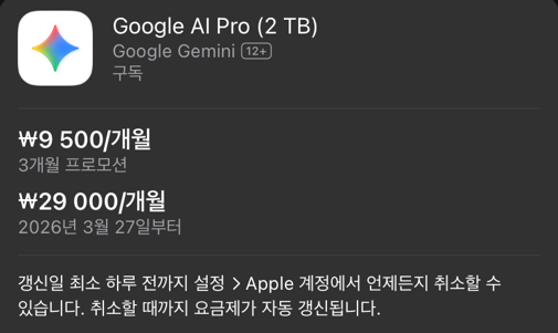 구글에서 3개월동안 제미나이 프로 구독료를 3개월동안 9500원으로 할인중이다.
