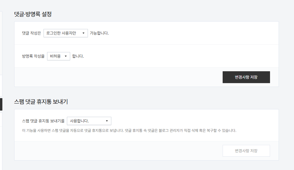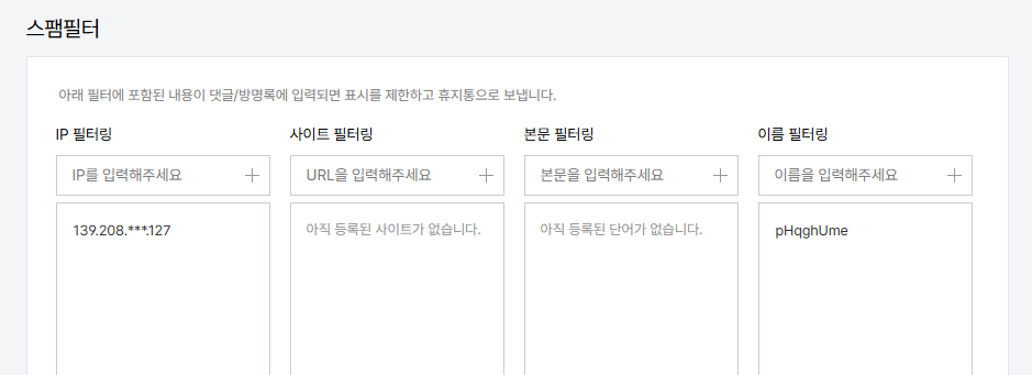 관리 페이지에서 좌측 댓글/방명록 > 설정에서 댓글 작성자를 제한하고 스팸 휴지통 설정을 하는 수 밖에..