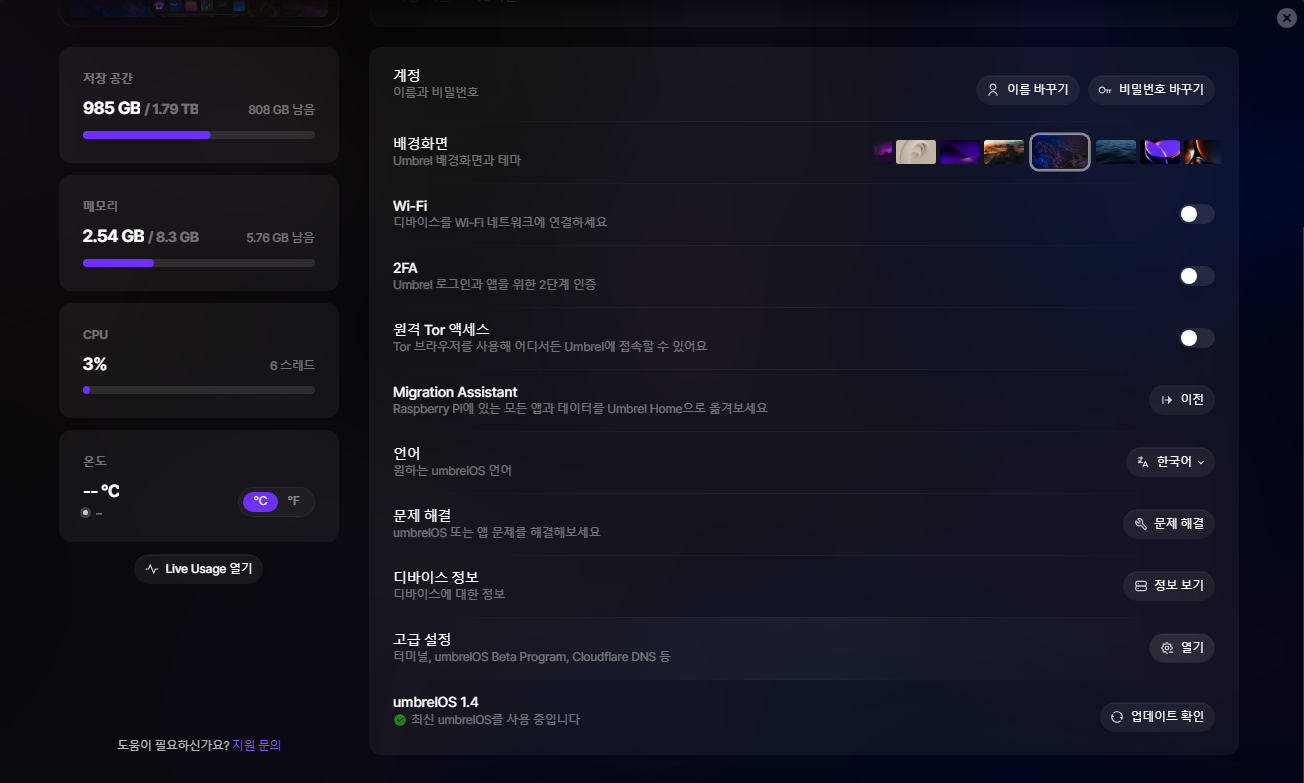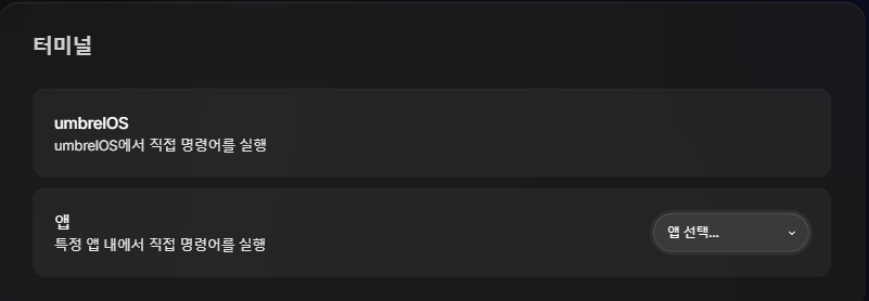 터미널은 상단의 umbrelOS에서 직접 명령어를 실행을 선택한다.