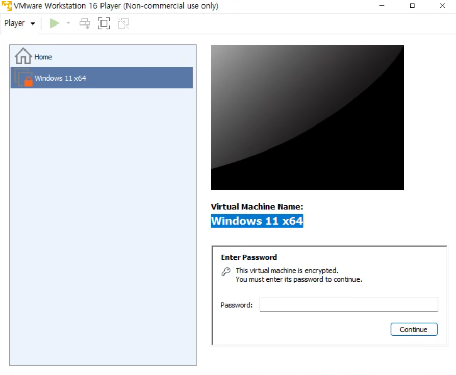 이후 Vmware Workstation을 다시 실행하면 불러왔던 가상머신에 비밀번호를 요구하는 UI가 사라지고 사용이 가능하다.