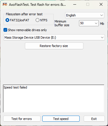 Test speed 버튼을 눌렀더니 sd카드에 검사용 파일을 무수히 작성하다 실패가 떳다.