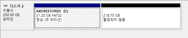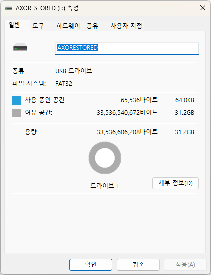 SD카드 속성을 들어가니 이름이 AXORESTORED로 바뀌었고 용량도 32GB정도로 줄어있다.