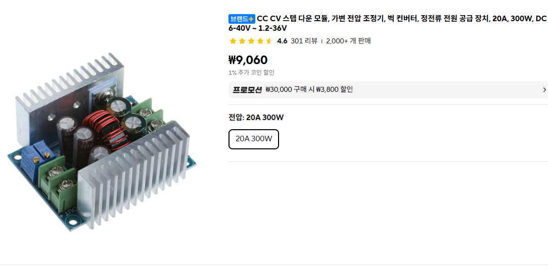 만일을 위해 넉넉하게 20A 300W 까지 사용 가능하다는 보드로 주문했다.