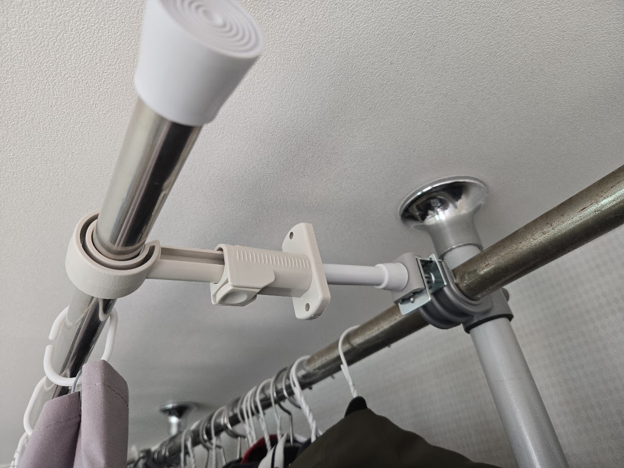 이전에 다이소에서 산 물건들로 옷걸이 행거에 커튼을 달 프레임을 만들고 거리를 늘리는 작업을 한 적이 있었다.