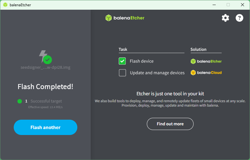 이미지 파일은 50MB 정도 크기로 balenaEtcher로 sd카드에 구웠다.