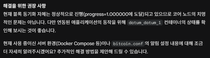 해결을 위한 권장 사항 현재 블록 동기화 자체는 정상적으로 진행(progress=1.000000에 도달)되고 있으므로 코어 노드의 치명적인 문제는 아닙니다. 다만 연동된 애플리케이션의 동작을 위해 datum_datum_1 컨테이너의 상태를 확인해 보시는 것이 좋습니다.