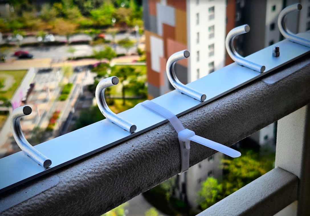주방 후크 2개를 난간에 붙이고 추후 다시 분리하기 쉽게 손으로 뺄 수 있는 케이블타이를 보조하는 용도로 조여주었다.