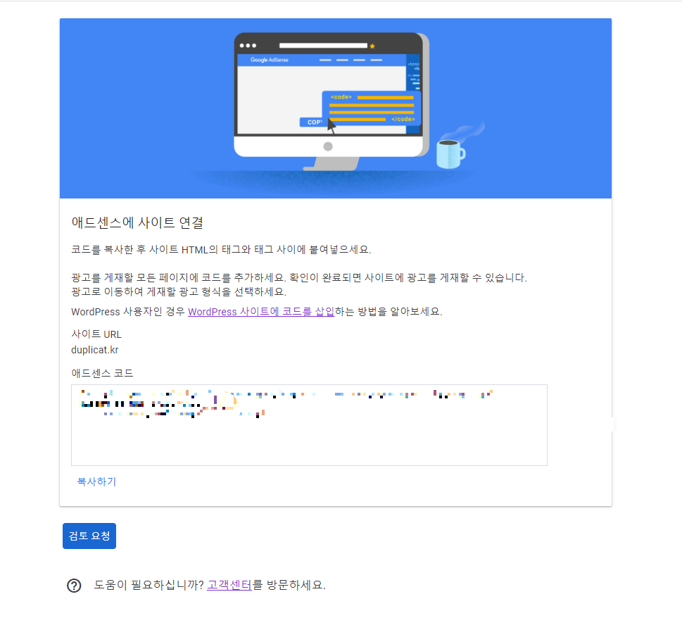 애드센스에 사이트 연결을 위해 코드를 삽입하라는 페이지가 뜬다. 당연히 미리 해둔건데 왜 이게 뜨는 건지는 모르겠다.