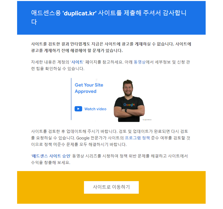 원래는 여기서 통과하면 내 도메인으로 사이트를 만들어서 광고를 붙여보고 싶었는데 생각보다 쉽지 않다.