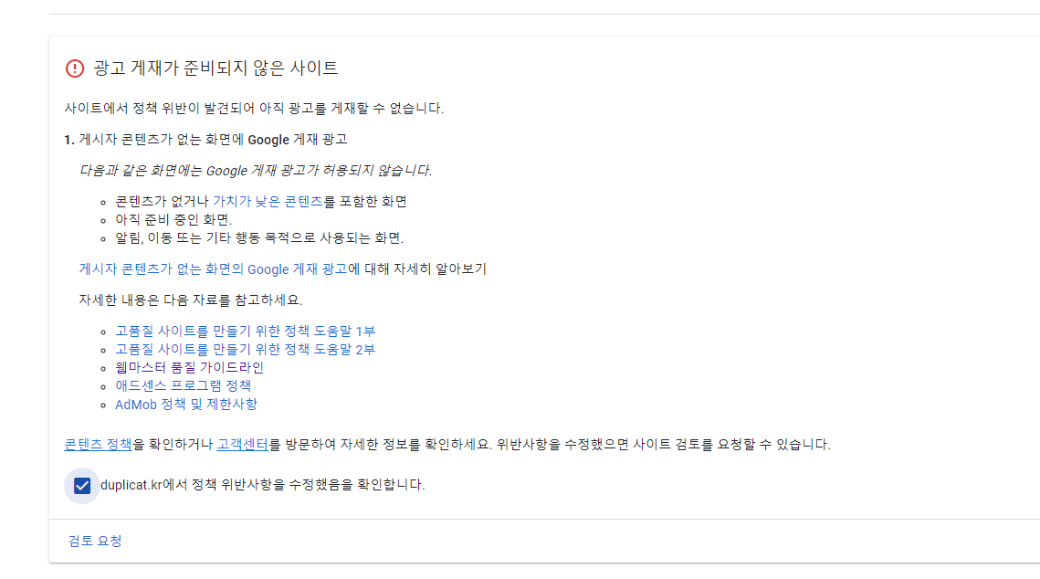일단은 무조건 검토 요청을 보냈다. 어짜피 결과는 최소 2주는 넘게 지나야 오니 그냥 빨리 눌러놓고 블로그 글들을 개선하고 채워놓는게 낫다고 한다.