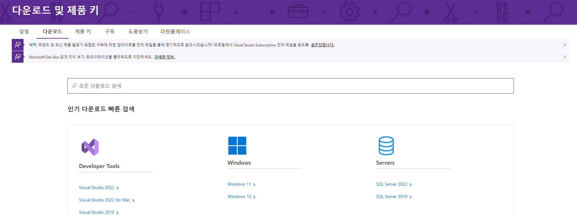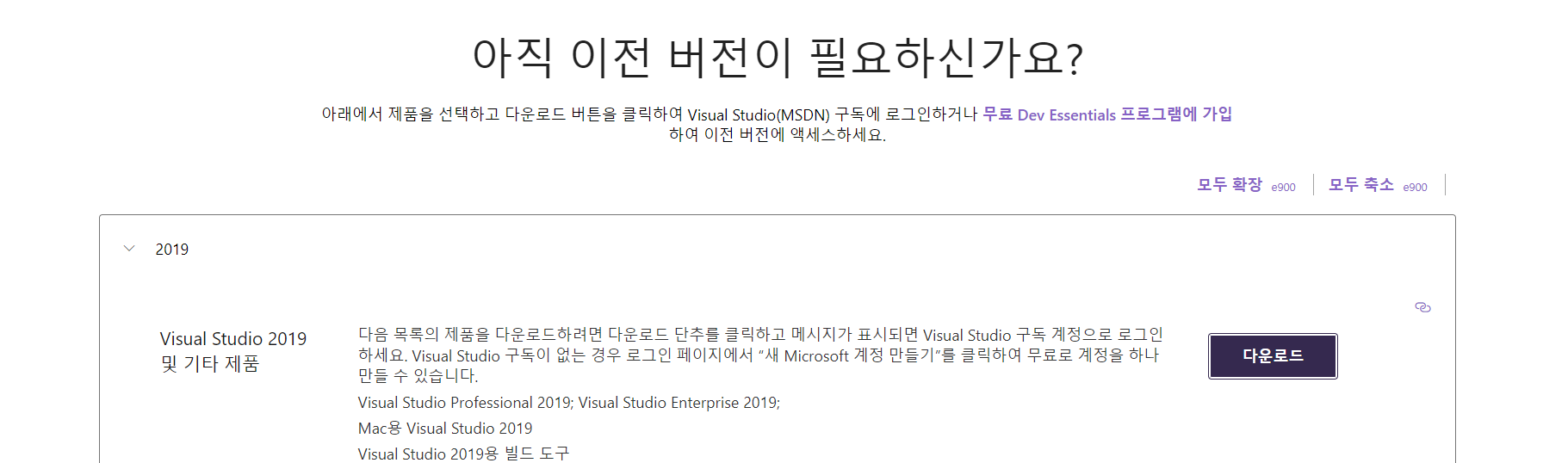 마이크로소프트 계정 로그인을 하면 친절하게 이전 버전이 필요하냐고 하면서 다운로드 버튼 하나가 있다.