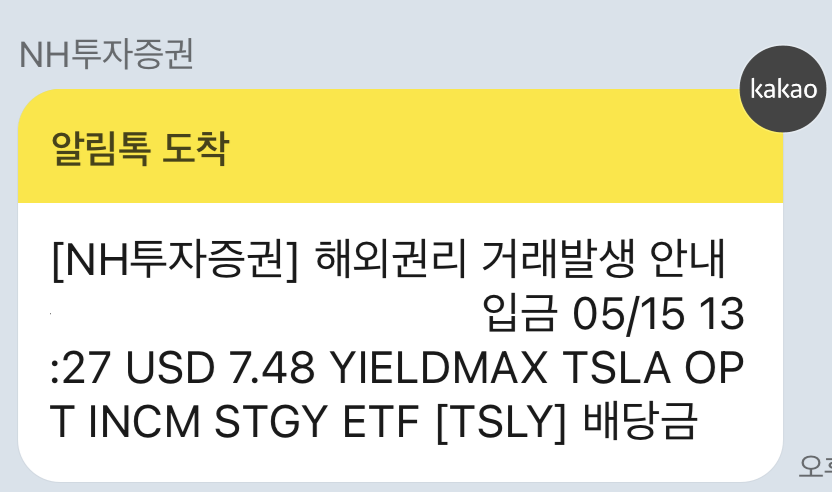 Pay Date 발표날에 맞게 TSLY에서 배당을 받았다. 역시 반토막이 나서 약 7$를 받았다.
