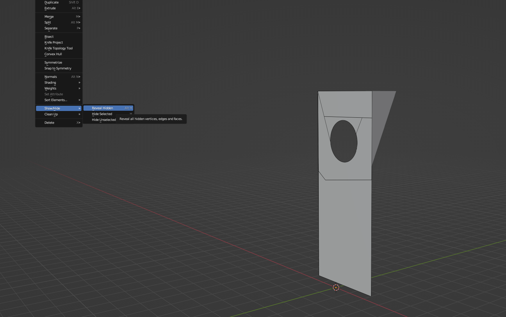 Edit 모드에서 숨겨진 면을 다시 보이게 하려면 Mesh에서 Show/Hide > Reveal Hidden 을 클릭하면 된다.
