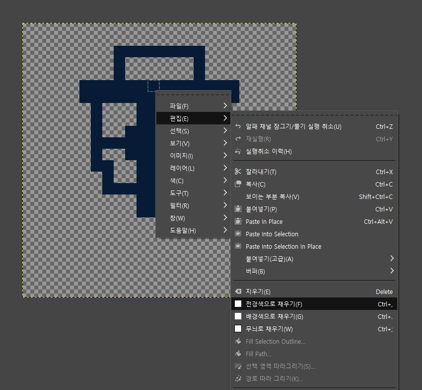 4. 아이콘을 우클릭하고 아래와 같이 전경색으로 채우기를 누른다. 또는 단축키 컨트롤 키 + ,(쉼표) 를 입력한다.
