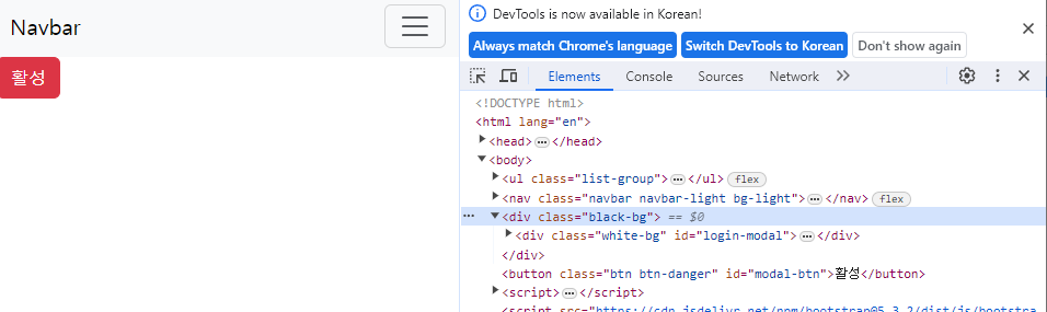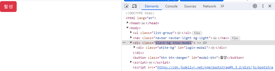 분명 css를 적용한 class 를 추가했는데 모달창이 뜨지 않았다.