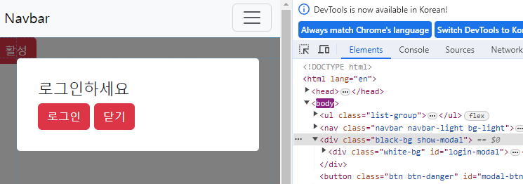 이제 버튼을 누르면 모달 창이 제대로 뜬다. 닫기를 누르면 다시 꺼진다.