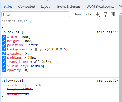 분명 css를 적용한 class 를 추가했는데 모달창이 뜨지 않았다.