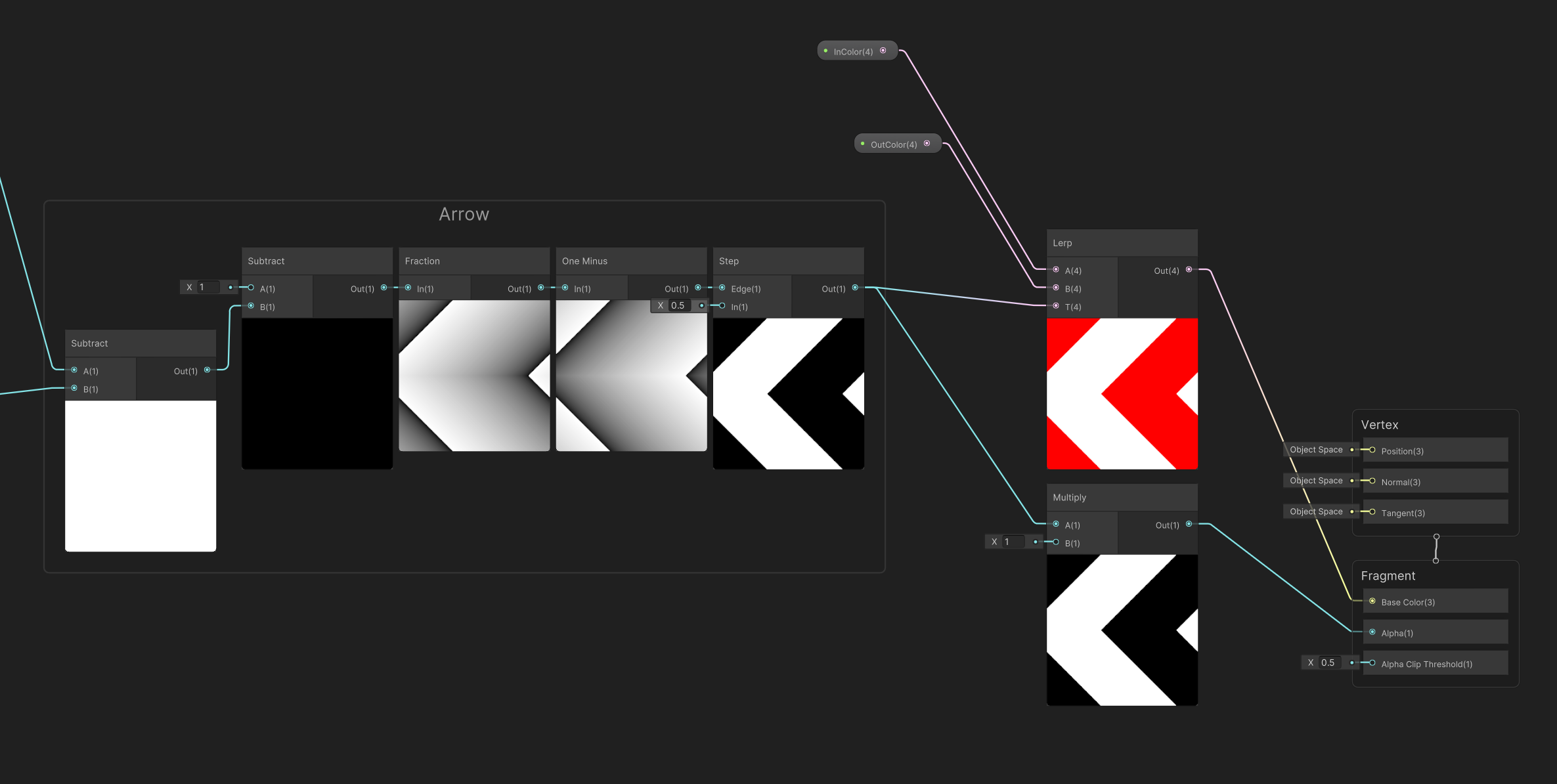 위와 같이 같은 쉐이더그래프를 사용하지만 화살표의 방향이 달라야 할 때, 머티리얼의 속성을 바꾸면 모두 바뀌어버린다.