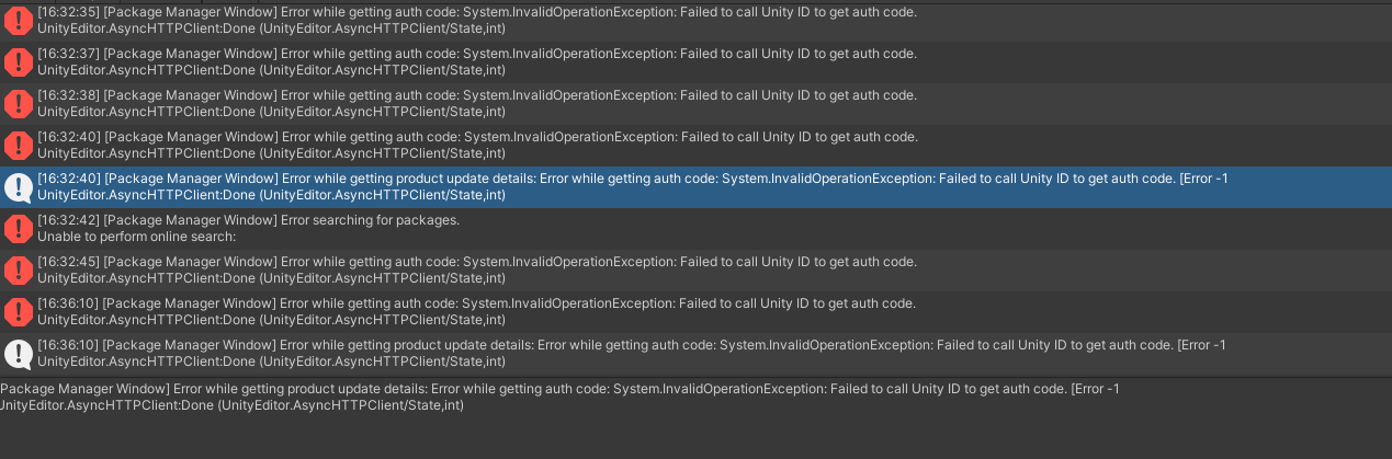 [Package Manager Window] Error while getting product update details: Error while getting auth code: System.InvalidOperationException: Failed to call Unity ID to get auth code. [Error -1