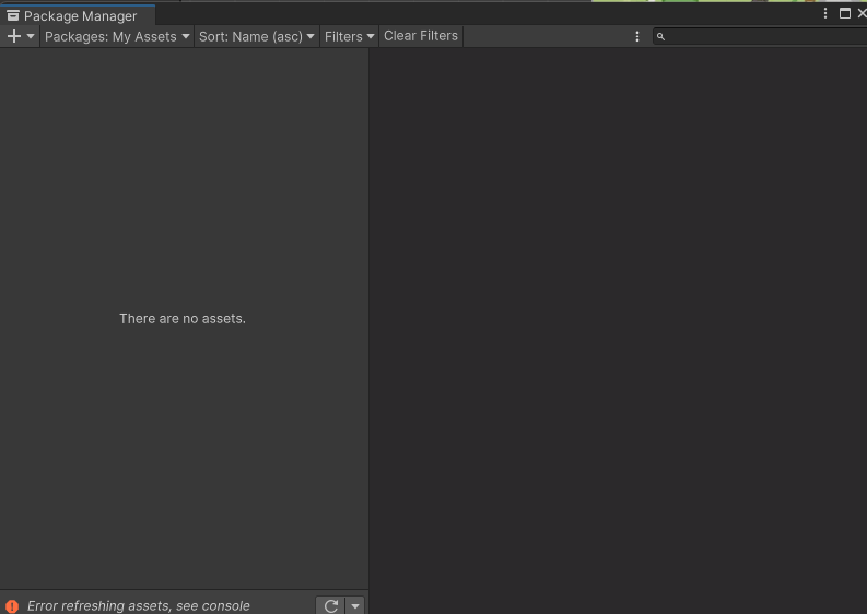 유니티 프로젝트를 열고 패키지 매니저를 열었을 때 아래와 같이 My Assets를 불러오기를 실패하는 현상이 발생했다.