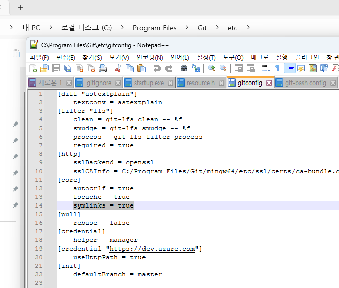 프로그램 파일 > Git > etc 안의 gitconfig에서