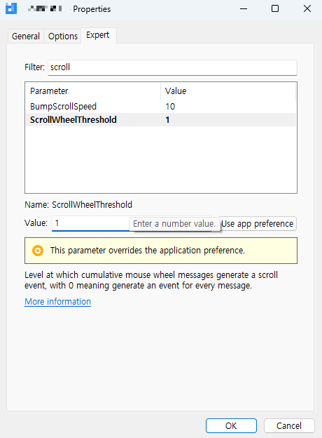 2. Expert 탭에서 ScrollWheelThreshold를 찾아서 값을 조절한다.