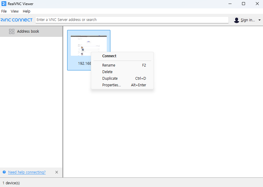 1. RealVNC 첫 페이지에서 사용할 pc 썸네일에 우클릭 > (Properties...) 클릭