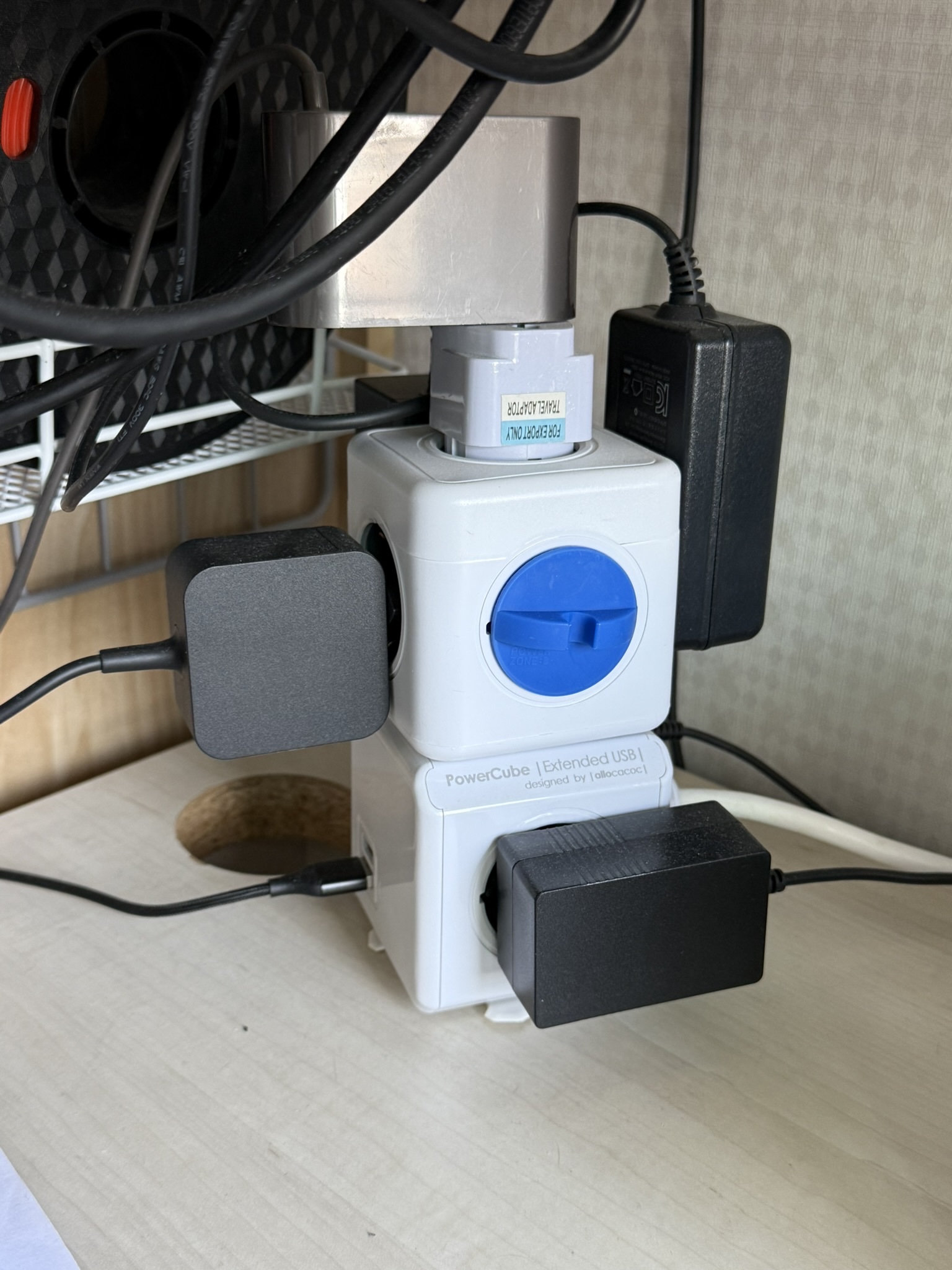 내 책상의 왼쪽에는 멀티탭 하나가 탑처럼 서있다.