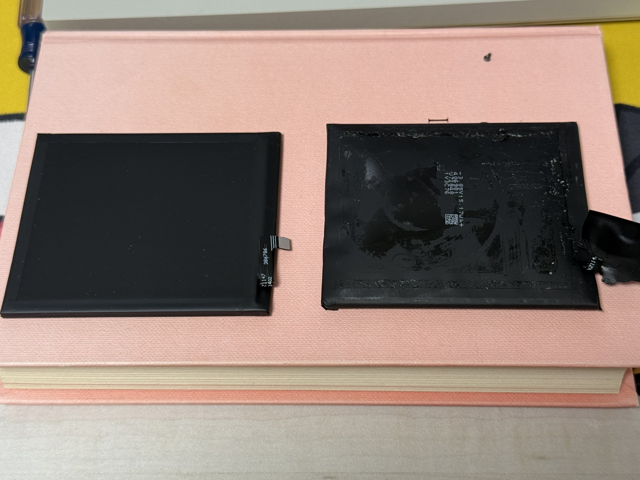 분리된 배터리와 교체할 배터리를 비교해보니 그 차이가 엄청났다. 생각보다 엄청 부풀어 있었다.