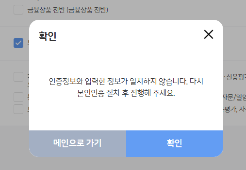 그런데 인증을 다 하고 정보를 다 입력하고 정보 저장하기를 누르면 아래와 같은 에러 팝업이 뜬다.