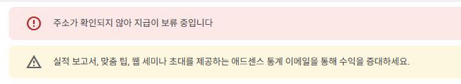 어느 날 구글 애드센스 페이지에서 주소를 확인하지 않아서 지급이 보류중이라고 경고가 떴다.