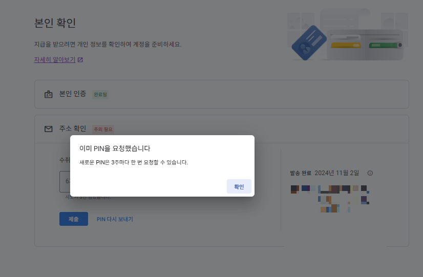 | 구글 애드센스 핀번호 우편으로 주소 확인하기 (0) | 2024.12.12 |