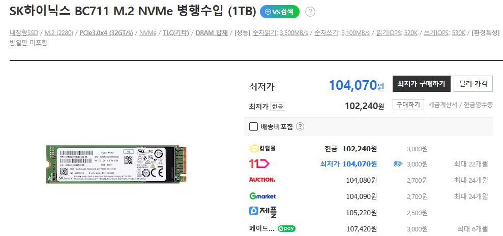 사용하던 미니PC의 용량 업그레이드를 위해 다시 BC711 ssd를 구입했다.