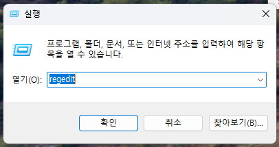 윈도우 + R 을 눌러 regedit을 입력해서 레지스트리 편집기를 실행한다.