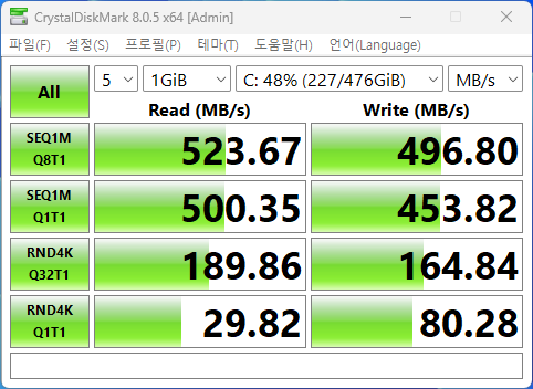 SSD 를 교체전 원래 속도를 측정하니 대략 500MB/s 정도 나왔다.