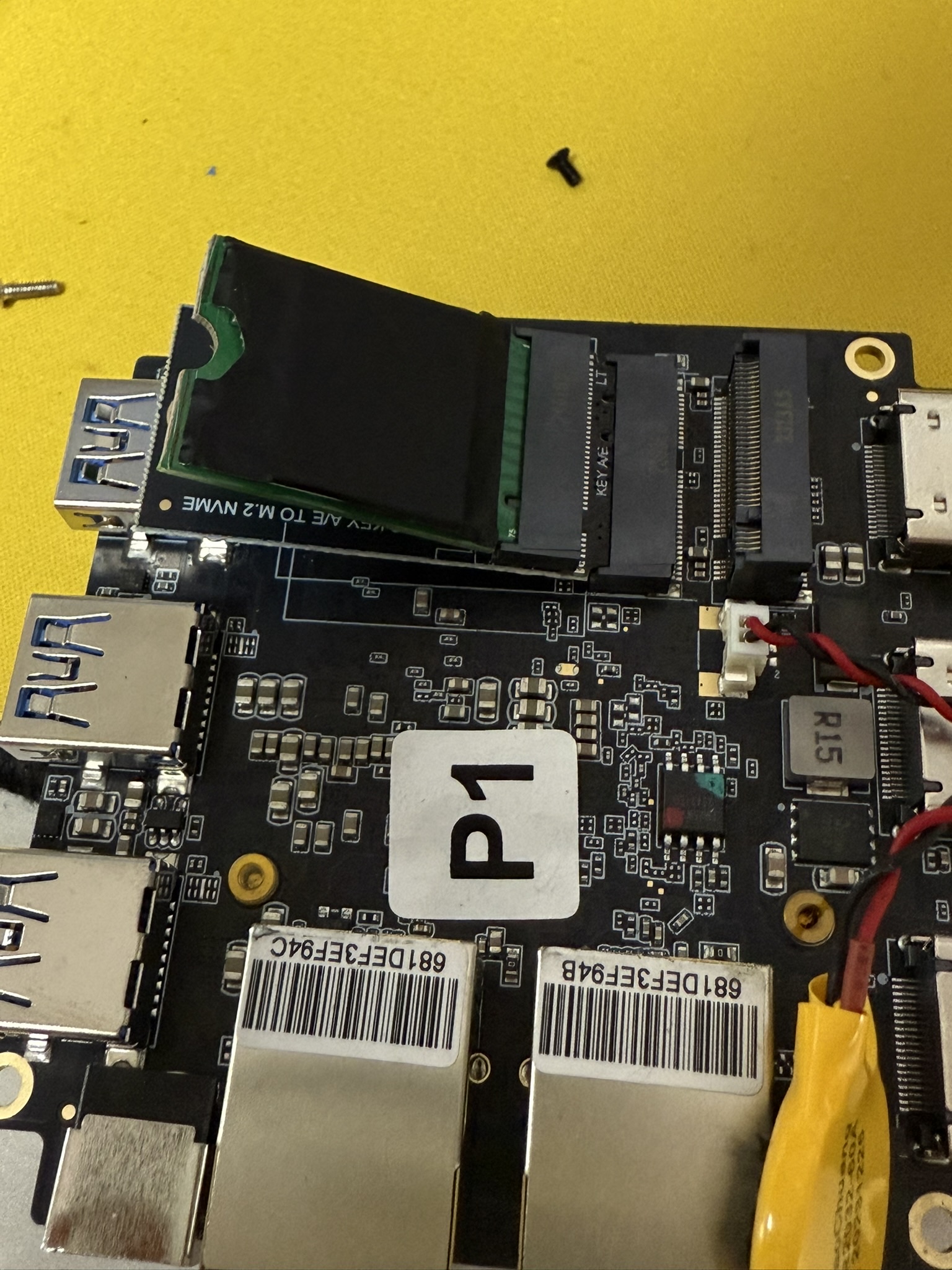 저 아래 슬롯의 공간이 작아서 ssd가 2230 크기인데도 일반적인 설치를 할 수 없다.