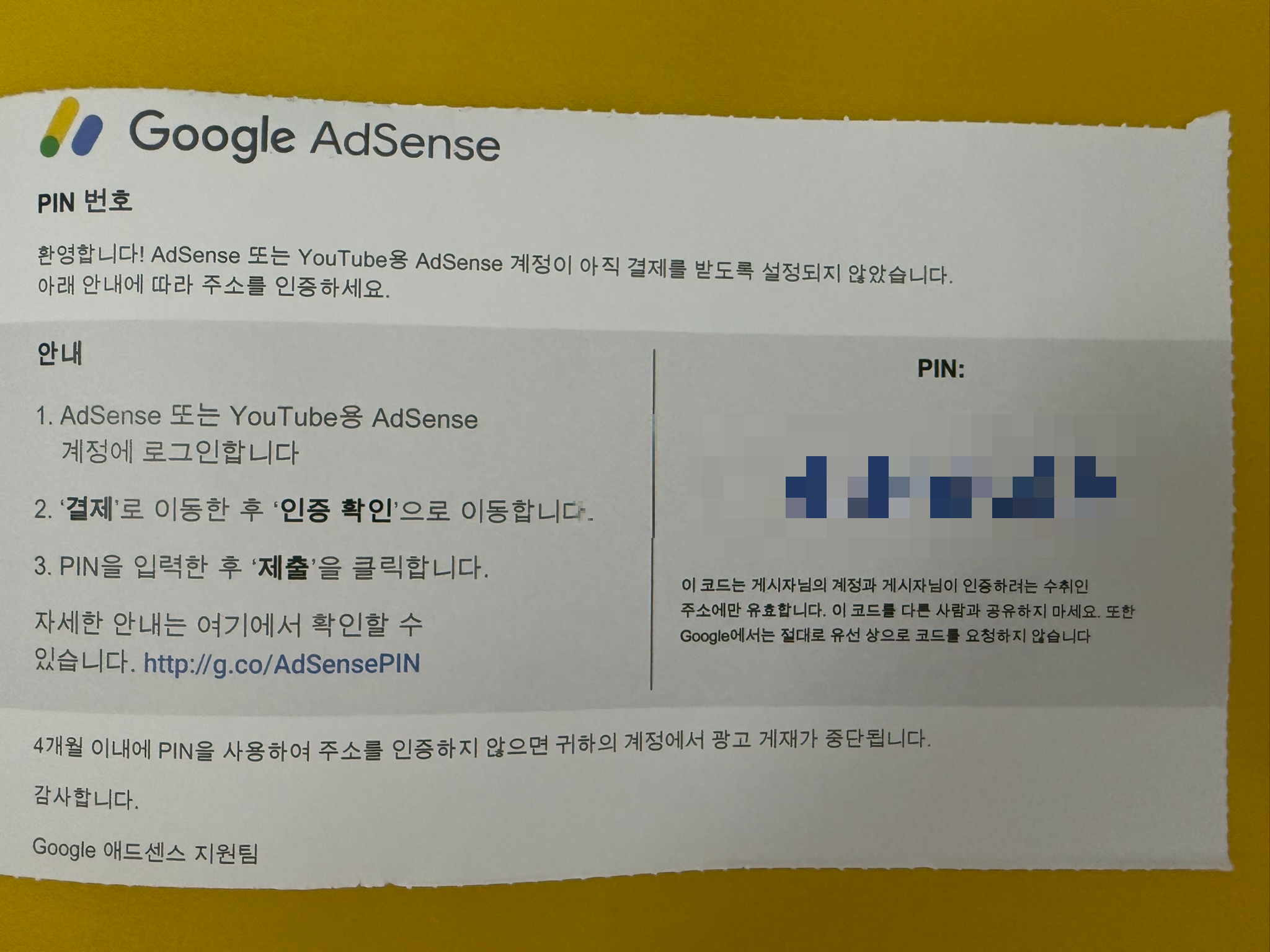 구글 애드센스 PIN 다시 보내기