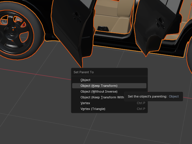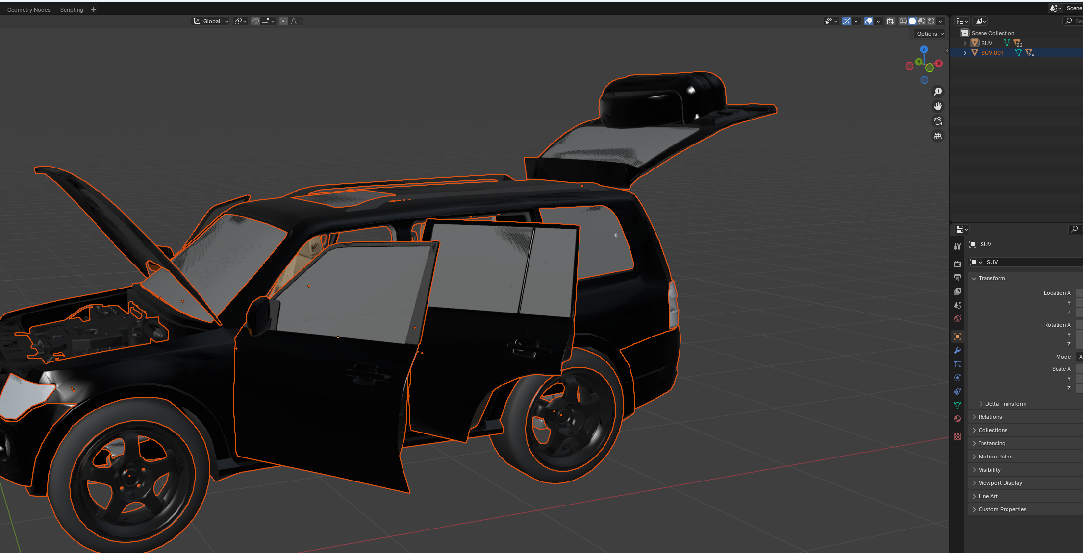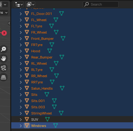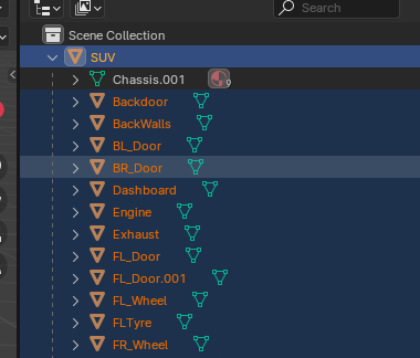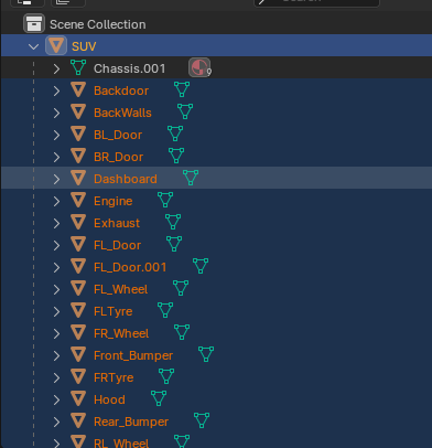 다만 원래 모델링은 SUV 오브젝트가 부모이고 나머지 오브젝트가 자식 오브젝트 관계였는데