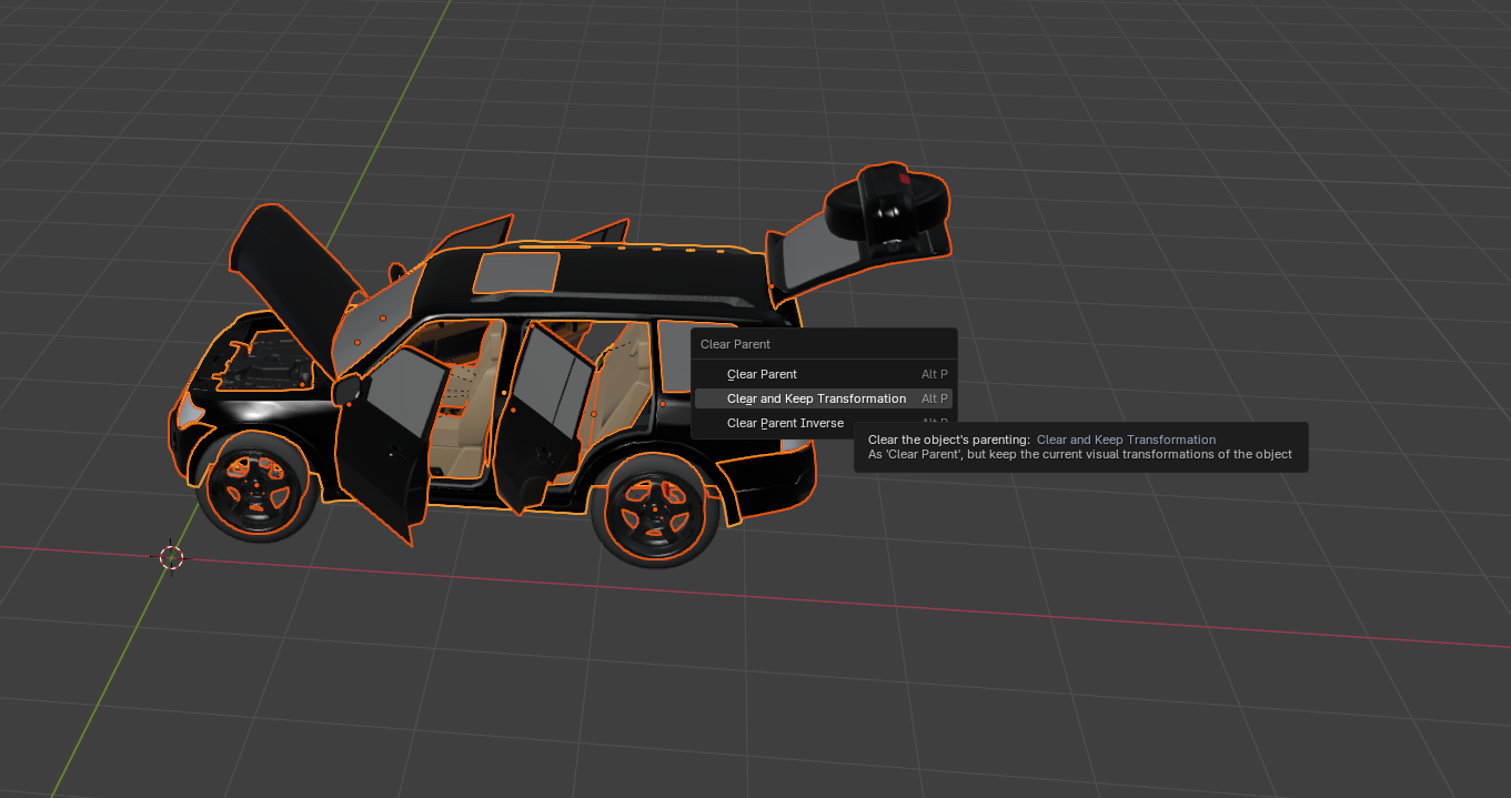 Clear and Keep Transformation을 선택하면 오브젝트의 위치와 크기가 고정된 상태로 모든 부모 관계가 끊어진다.