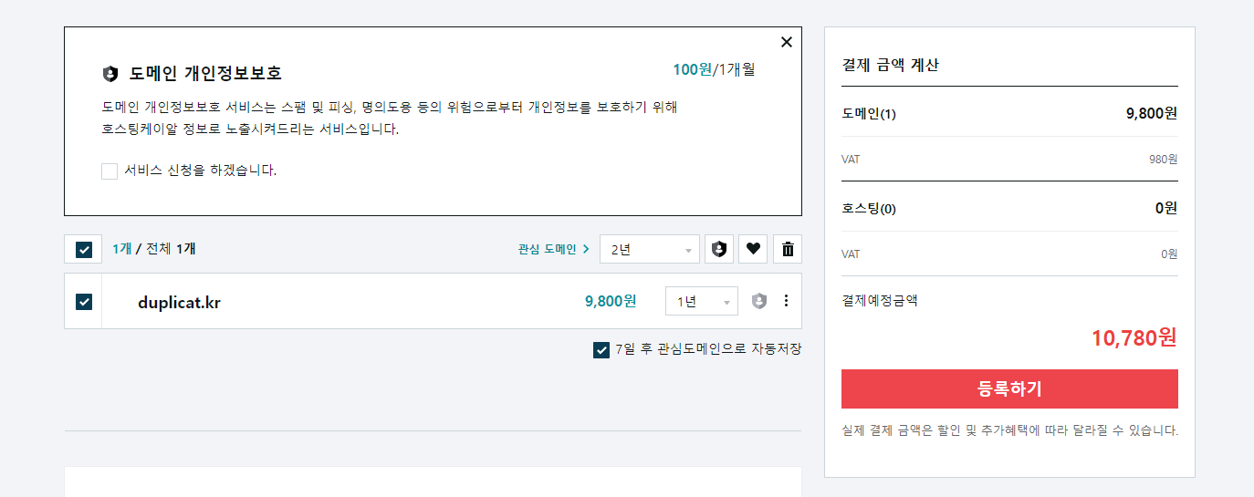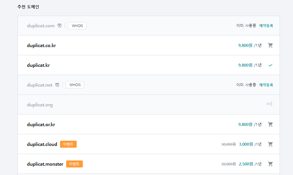 도메인 주소에 따라 가격은 다양한 것 같다. 그래도 기왕이면 오래 사용할 수 있을만한, 익숙한 도메인을 골랐다.