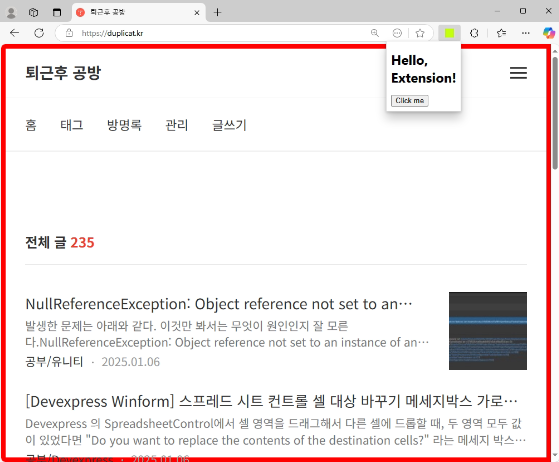 확장 아이콘을 클릭하니 Hello Extension! 문구가 적힌 패널이 뜬다.