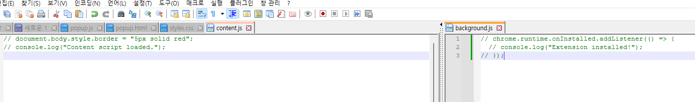 우선 background.js와 content.js와 같이 필요 없는 코드들을 비활성화했다.