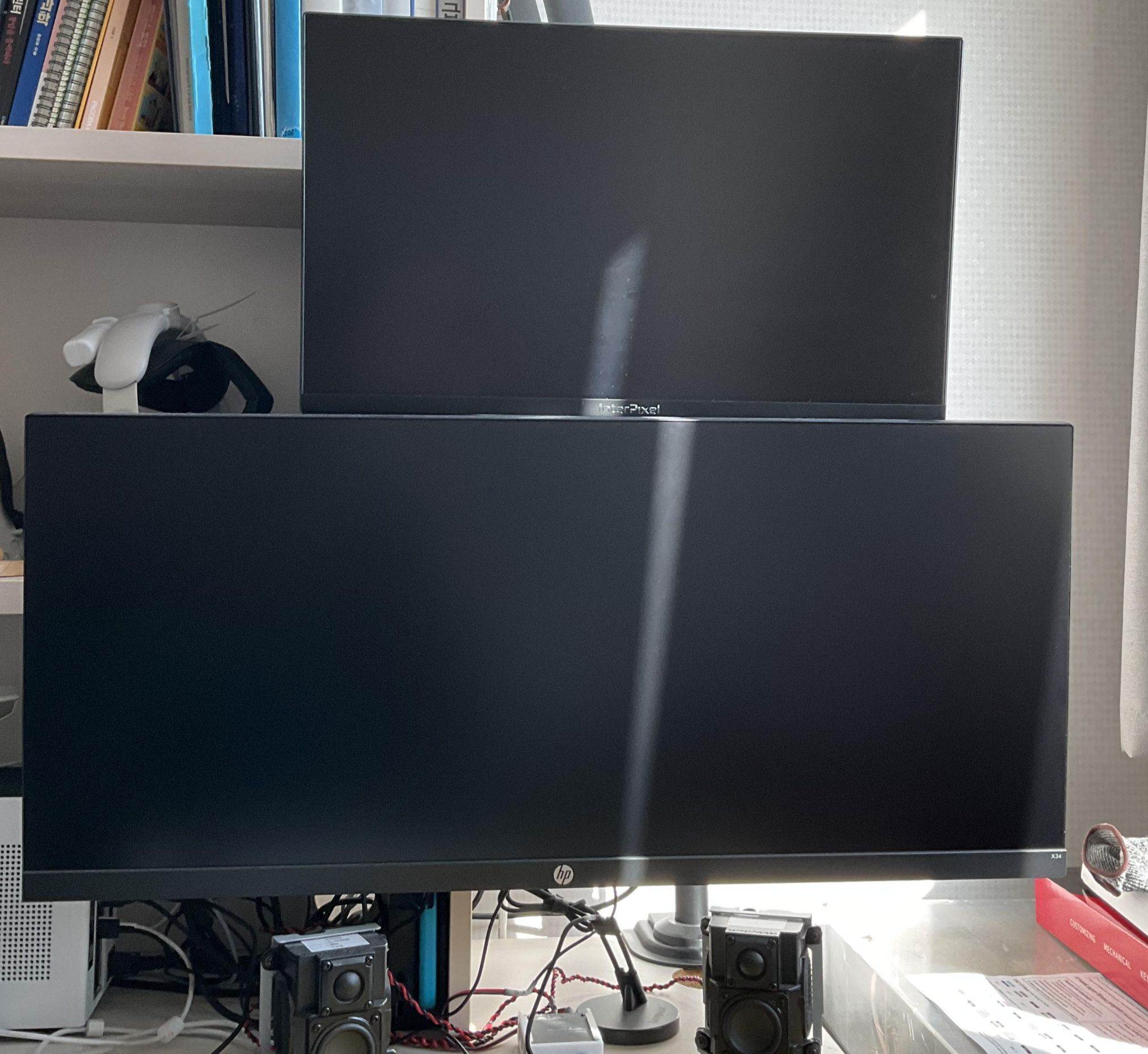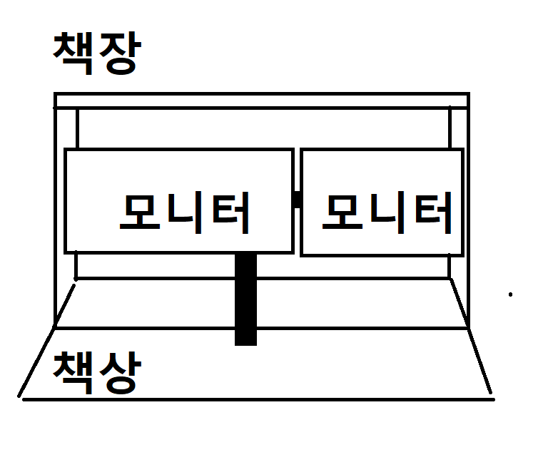 모니터 두대가 책장 안쪽으로 다 들어가지 않는다. 줄자가 없어서 눈대중으로 맞추기만 한것이 화근이었다