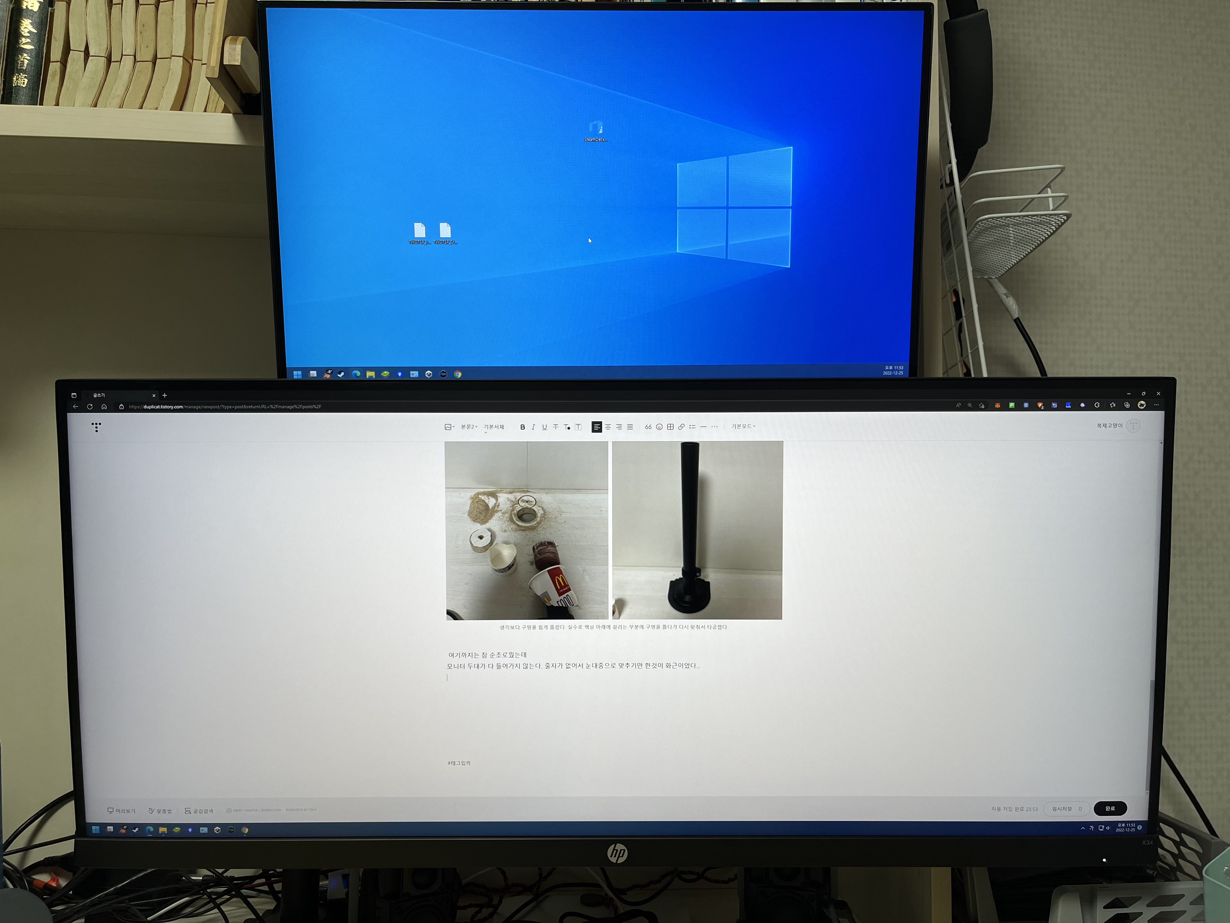 책장의 가운데를 떼고 가운데에 모니터를 설치해서 그나마 안전하고 편안하게 사용해야겠다고 마음먹었다.