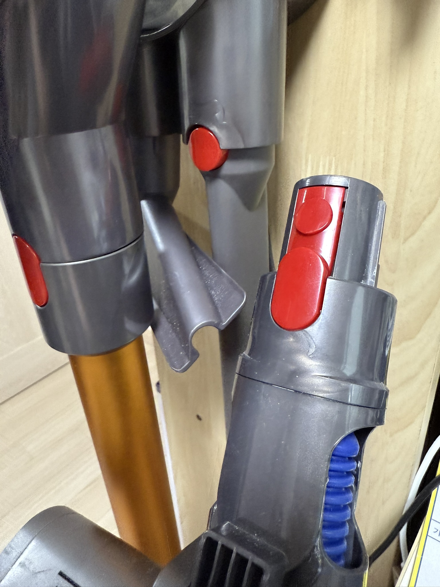 다이슨 청소기의 헤드와 봉이 하나 둘 늘어나면서 스탠드에 걸 수 있는 자리가 부족해지고 있다.